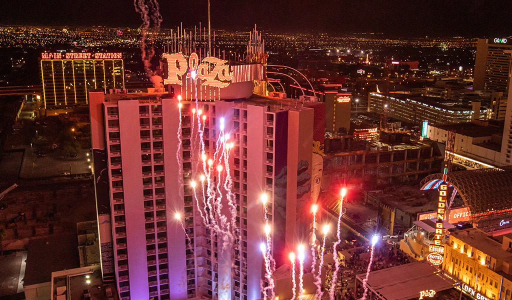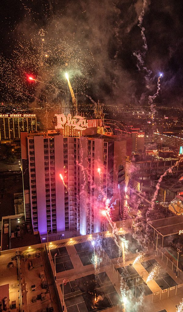Every Friday night, the Plaza lights up the sky over downtown Las Vegas with a fireworks show inspired by the magic of Disneyland.
