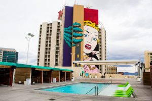 The Plaza Hotel & Casino also welcomes a new mural by FAILE, a Brooklyn-based artistic collaboration between Patrick McNeil and Patrick Miller, that is the duo’s largest in the world. Their work can be described as a combination of “high” and “low” culture. The mural will overlook the busy I-15 freeway and have about 200,000 cars driving past it every day.