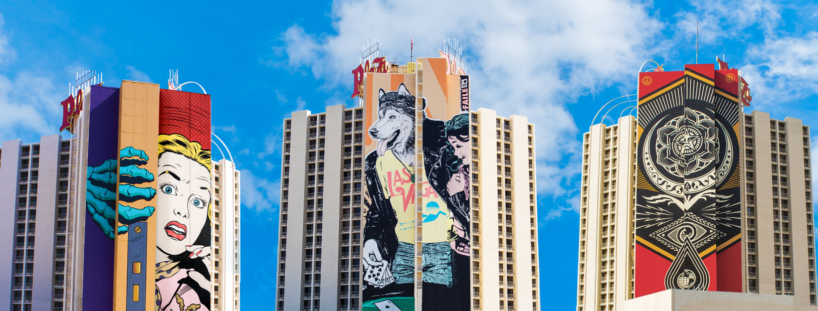 Street artist Shepard Fairey brought his signature imagery to the downtown district with his newest piece entitled “Cultivate Harmony.” Visible from multiple vantage points in downtown, the mural spans a 21-story tower, making the Plaza the tallest building he has painted in Las Vegas. Downtown Las Vegas is also home to Fairey’s 2016 “Corporate Welfare” mural.