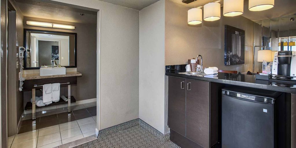 Located on the top floor with Las Vegas skyline views (approximately 945 square feet), each loft-style suite features a spa-style marble bathroom, bar refrigerator, 42″ flat screen television with premium cable channels, in-room safe, coffee maker and deluxe room amenities.