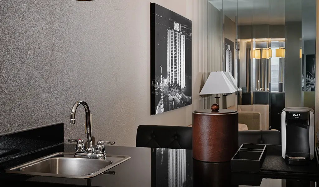 Our one bedroom suites (approximately 650 square feet) come with a living room parlor, a total of 1.5 bathrooms, in-room safe, multiple flat-screen televisions with premium cable channels, mini refrigerator, coffee maker, wet bar and all of our deluxe room amenities. Each bed features luxury bedding with fresh and crisp triple sheeting and select pillows.