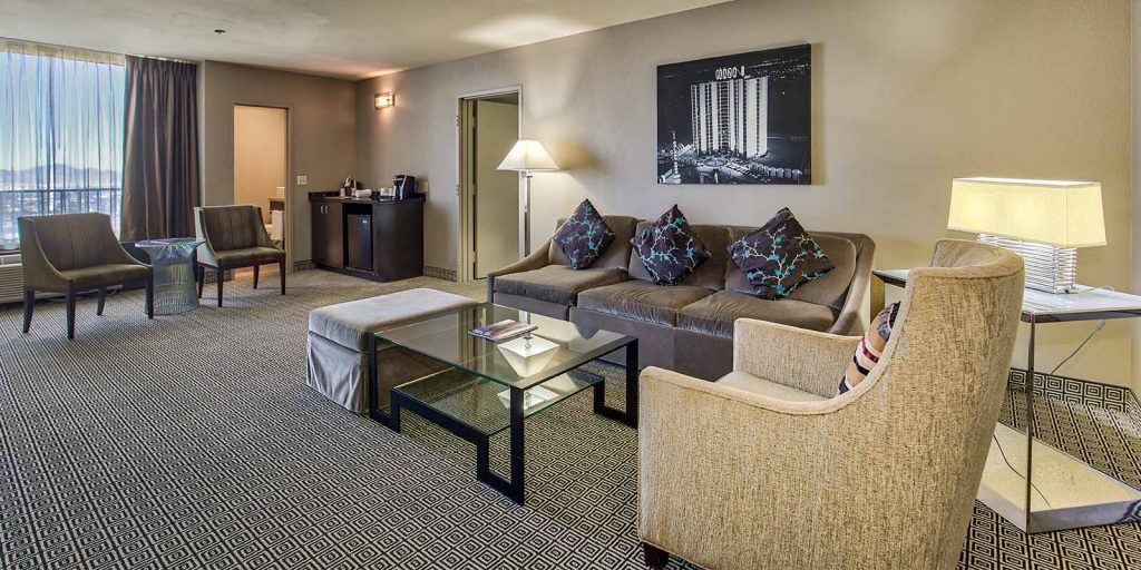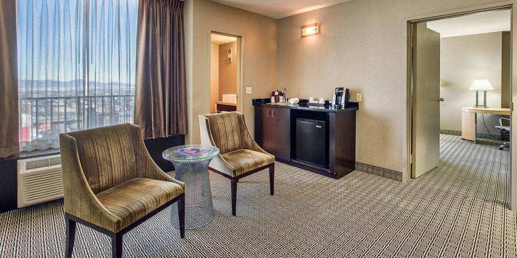 Located on the top floor with Las Vegas skyline views (approximately 945 square feet), each loft-style suite features a spa-style marble bathroom, bar refrigerator, 42″ flat screen television with premium cable channels, in-room safe, coffee maker and deluxe room amenities.